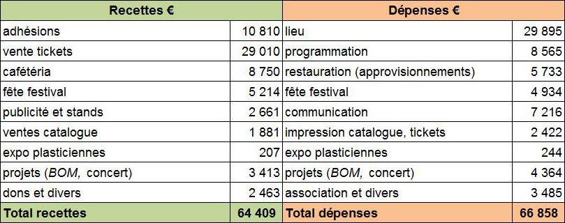 Côté dépenses (hors prix du scénario), l'équipe du 15e festival a réalisé d'importantes économies notamment en ce qui concerne le lieu (-16%), la programmation (-11%) et l'impression du catalogue (-19%). Cette baisse globale (-9%) n'est toutefois pas suffisante pour compenser la diminution générale des recettes (-7%) consécutive à la moindre fréquentation du festival. La cafétéria a cependant amélioré son résultat grâce au choix d'offrir plus de préparations "maison". L'utilisation de tickets vendus à une caisse spécifique hors du bar a été appréciée de l'équipe comme des festivalières.