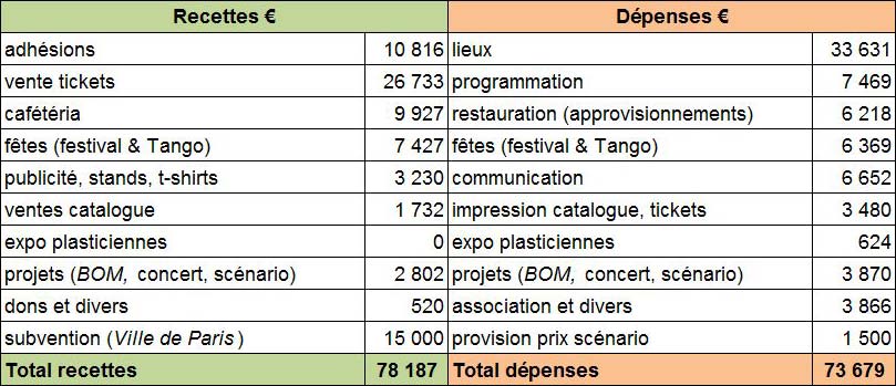 Côté recettes, si les adhésions demeurent stables, la fréquentation des séances est en hausse, mais le produit des ventes de tickets diminue (-8%) en conséquence de l'affectation d'une part de la subvention à la baisse des tarifs, dans le but de permettre l'accès aux projections au plus grand nombre. Les efforts fournis par l'équipe Restauration pour proposer plus de préparations maison ont permis d'améliorer l'excédent de la cafétéria (+13,5%). On note aussi une baisse des recettes de publicité, les partenariats conclus ayant principalement porté sur des échanges de communication.