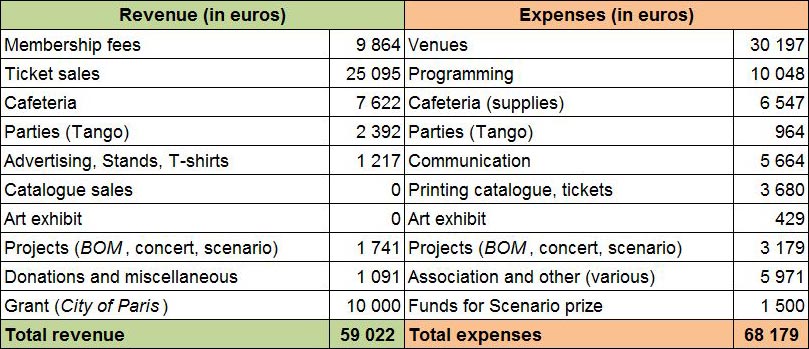 Despite these cost savings, spending increased in other areas, especially programming where the heavy cost of transporting films led to a 39 percent increase in outlay. It also cost us six percent more to print the brochure, which we published in large quantities in order to be able to distribute free to festival goers, bookshops, bars and associations. Profits were also down in the bar, due to an increase in prices by our suppliers which we did not pass on when setting our own prices. And of course the drop off in attendance at the festival had a knock on effect on takings at the bar, and we ended up throwing things like sandwiches and fresh produce away.