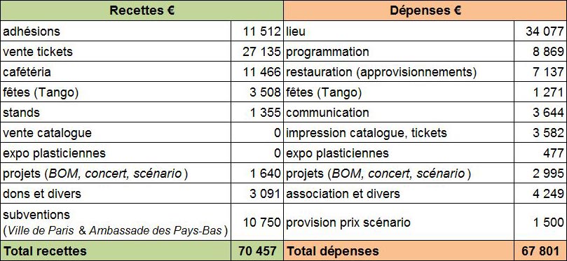 Les dépenses de fonctionnement restent stables. La subvention de la Ville de Paris, reconduite pour un montant inchangé de 10 000 € (14% des ressources), a permis notamment de maintenir des tarifs faibles pour les entrées en séances, de distribuer gratuitement le catalogue, de prendre en charge l'adhésion des réalisatrices présentes et d'aménager l'espace d'accueil des réalisatrices et artistes dans le jardin d'hiver.