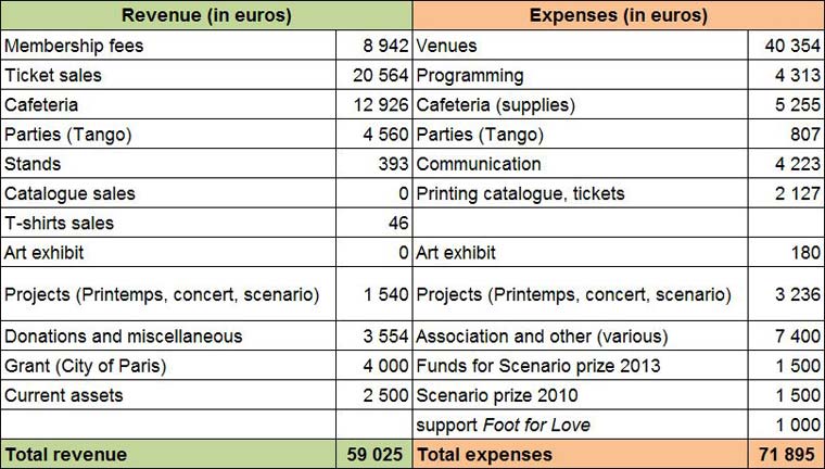 With the drop in subscriptions and entries, the decrease in income from the "Printemps de Cineffable" and the reduction of the operating grant allocated by the City of Paris, our resources have receded by 15% in comparison with the previous financial year. Adding to this the 3% general increase of expenses gives a result showing a deficit of 12 870 € in 2012. The increase of expenses mostly concerns the venue (more expensive theatre rental, choice of a high definition video projector for the large auditorium), supplies for the cafeteria (compensated by an increase in income) and the settlement of the prize for the scenario competition 2010 of which the winning short film was completed and screened at the festival. Other expenses are under control with little but recurrent increases, which concern the inevitable structural expenses (storage rent, insurance, taxes, contributions).