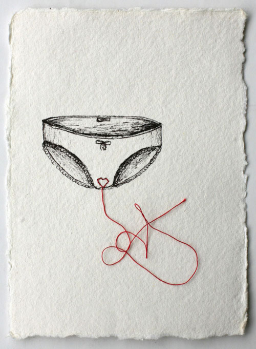 « Back to the Origin » de Frankie M est une série de dessins, peintures et broderies sur papier, de son sexe et de son sang, comme un retour originel.