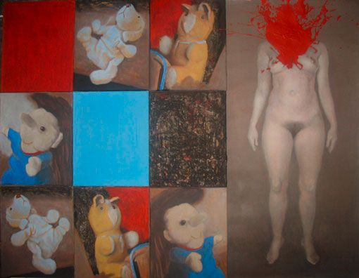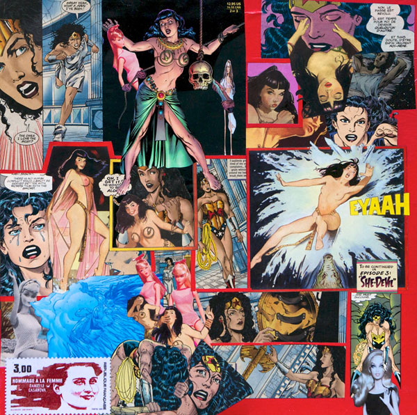 « Barbie au Tapis » de Céline Delas est un ensemble de collages au ciseau d'images médiatiques donnant à voir un monde féminin et volontairement combattif, utilisant les stéréotypes pour mieux les détourner.