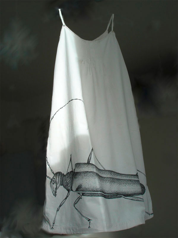 « Nous ne le savions pas » de Marjolaine Dégremont est une installation de robes blanches de petites filles sur lesquelles sont dessinés des insectes, telle une « poésie indicible associée à une blessure ».