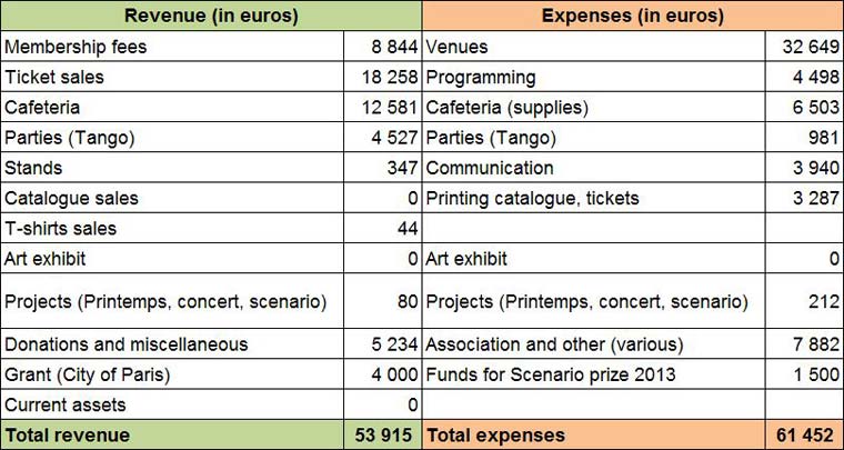 Taking into account last year's deficit, we appreciably reduced the organization costs (- 15%). That was not enough however to re-establish a financial balance because of the drop in attendance and membership, in spite of the strong mobilization of festival-goers in the form of donations. The savings came mainly from the venue and equipment rental, while the programming expenditure remained stable in order to maintain the quality and the diversity of the films proposed at the festival and to continue to support the film directors.