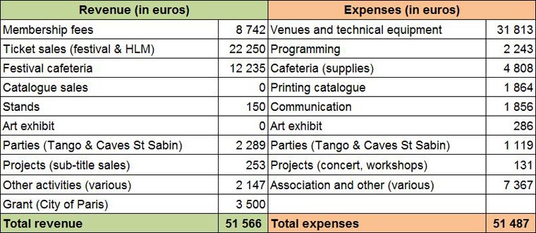 The City of Paris has renewed its €3500 operating subsidy. The treasury is stable but remains insufficient at the approach of the festival and several people on the team had to advance funds or pay bills directly.