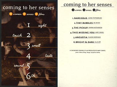 "Coming to Her Senses" is a series of six shorts made by six of the best independent women directors in Vancouver. This program is devoted to the exploration and experience of women's sensual and sexual being. The filmmakers involved in the project were chosen for their approach to the film centered on the female figure, the peculiarities and particularities of their style, and their genuineness. Each of them was assigned one of the five senses (plus one more: the sixth), and was asked to return with a 3 minutes film.